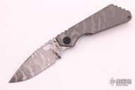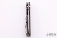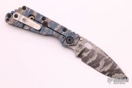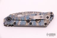 This SMF by Mick Strider features a laser engraved blade with thumbhole and notched thumbrest. The handle has laser engraved aluminum and titanium frame and tip up titanium clip, has black hardware and an anodized titanium lockbar stabilizer. Notches on thumbrest, rear of handle. Nice detent, blade seating and lockup. New condition.
