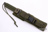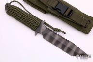 The BN-SS by Strider features a tiger stripe tanto blade with a serrated top edge .248" blade stock and 1.490" blade depth, full tang construction. The handle has a green paracord wrapped handle. Comes with a green nylon sheath. New condition.