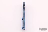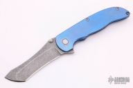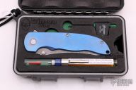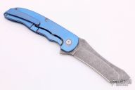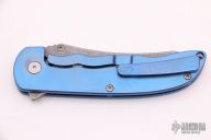 This Norseman (#1502) by John Grimsmo features a stonewashed blade with a single anodized titanium thumb stud, notched thumb ramp and flipper. Anodized and orange peel finished titanium frame with titanium screws. Has a matching clip with hidden screws. Very smooth action that requires no wrist movement. Nice detent, lockup and blade seating. Rides on ceramic bearings. Knife is in excellent condition, shows no signs of use or carry. Comes with original packaging, custom hard case, Nano-Oil, tool, and COA.