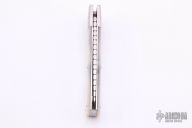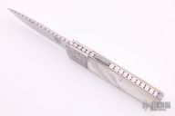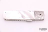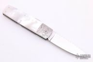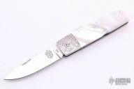 This knife by Doc Hagen features a mirror polished blade with fileworked spine and nail nick. The handle has engraved and dovetailed stainless steel bolsters, mother of pearl scales, stainless steel liners, fileworked stainless steel backspacer. Nice lockup and blade seating. Comes with a zippered case. Has a few light scratches, otherwise excellent condition. #530