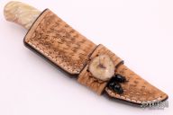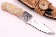 This Engraved Hunter by D'Alton Holder features a mirror polished blade with .130" blade stock and 1.046" blade depth, full tapered tang construction. The handle has engraved stainless steel bolsters by Bruce Shaw, Muskox scales with red liners and steel pins. Comes with original sheath. The scales are starting to separate from the tang, otherwise good condition.