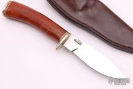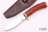 This Hunter by Virgil Campbell features a mirror polished drop point blade with .152" blade stock and 1.103" blade depth, hidden tang construction. The handle has a brass guard and butt with wood grip with red and white spacers. Comes with a brown leather sheath. Has some light scratches on the blade, otherwise good condition.