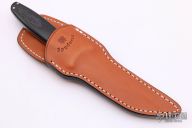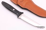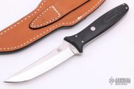 "It is only natural that Spyderco follow-up Bob Lum's folding tanto with a fixed blade, and a very classy one at that. It has a Hamaguri (appleseed) grind at the tip for added strength and the swedge on the spine lessens the overall weight. The blade has a tapered Tang, running the full length of the handle, adding overall strength. The expanded hand guard, where the blade and handle meet, makes it comfortable while gripping. Blade is hollow ground." The FB03 is a discontinued model no longer available from Spyderco. Includes original box, brown leather sheath and papers. Excellent condition. Excellent condition.