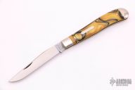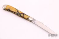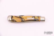 This knife by Great Eastern Cutlery features a satin finished blade with a single nail nick. The handle has nickel silver bolsters and brass liners, tiger eye acrylic covers. Has half-stop. Excellent Condition. Comes with original packaging.