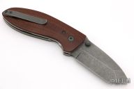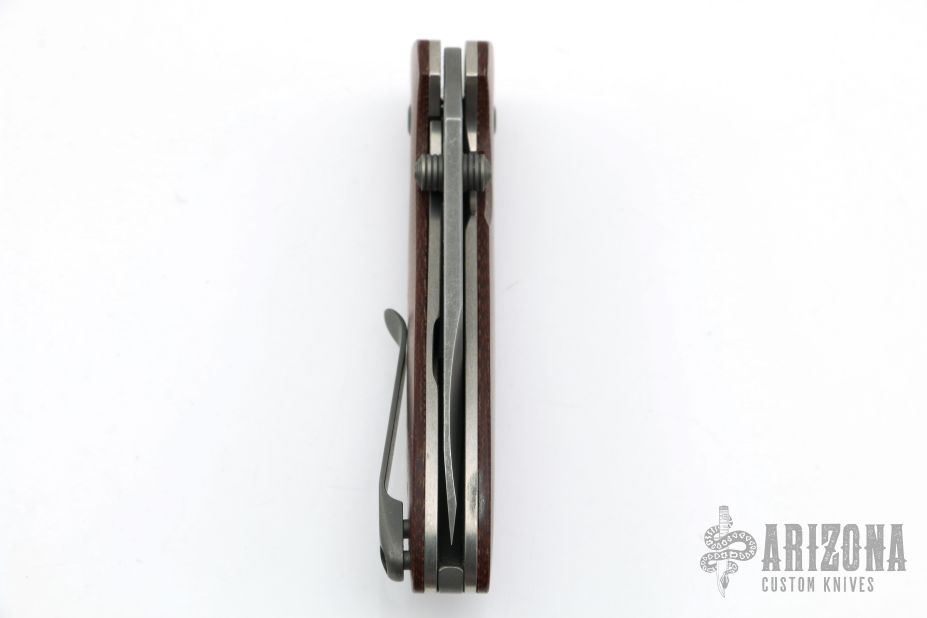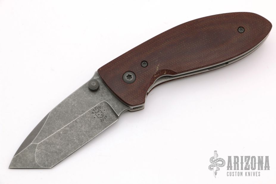 This Alpha framelock by Tom Krein features an stonewash finished drop point blade with dual thumbstuds and a false top edge. The handle has micarta scales, titanium liners and tip up clip, titanium backspacer. Nice lock up, detent and blade seating.  Light scratches are visible on the blade and handle otherwise the knife is in good condition.  Includes a padded case.