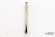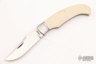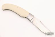 This Small Trapper by Rhidian Gatrill features a hand rub satin finished blade with nail nick. The handle has fluted stainless steel bolsters, paper micarta covers, stainless liners and spring. Has half-stop, flush in all positions. Comes with a zippered case. Excellent condition.