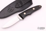 This Model L-1 Backpacker by Jimmy Lile features a satin finished blade with black linen micarta scales and nickel silver pins. Full tapered tang construction with .176" blade stock and 1.025depth. Handle has lanyard hole. Comes with black leather sheath made by Randall Made Knives and stamped "LILE". Has a few light scratches, otherwise excellent condition.