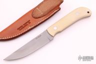This Early Ridge Runner by Shane Sibert features a bead blasted blade with notched thumbrest, .127" blade stock and 1.103" blade depth, full tang construction. The handle has bone linen micarta scales with brown liners, stainless steel pins and lanyard hole. Comes with a brown leather sheath. Has a little staining on the micarta, otherwise excellent condition. Nice early knife from Shane.