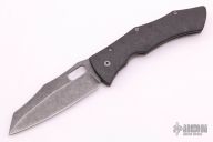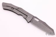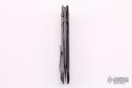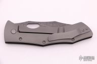 This R33 by Ed Cope features a bead blasted titanium and marble carbon fiber frame with bead blasted tip up clip, hardware and standoffs. The blade has a dark tumble finish with thumbhole and swedge. Comes with a zippered case. Nice detent, lockup and blade seating. Excellent condition.