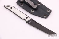With a 3.25” blade, you'll have a nice length to cut with... But since it's only ¾” tall it will fit in your pocket very comfortably. CPM-20CV blade steel is always a great choice for a small fixed blade -- not only for its stainless properties, but for its ability to hold an edge. The form-fitting Kydex sheath in right-pocket configuration, and will be at home in your front pocket as well as on your belt -- so choose the best place for you and carry it every day! SPECIFICATIONS Blade: 0.128” Thick, CPM-20CV, Black DLC Stonewash Finish Handle: 0.30" Thick, White G10 Overall Length:  Sheath: Kydex Sheath with Clip, Right Pocket Carry. New from maker.