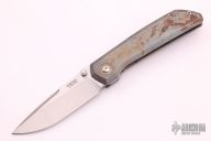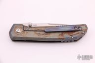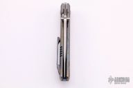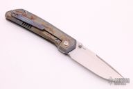 This Mula framelock by Enrique Pena features a satin finished drop point blade with swedge, notched thumbrest and dual thumbstuds. The handle has a bead blasted and Oil Slick finished titanium frame with a titanium backspacer. Matching tip up titanium clip. Includes padded and zippered case. Includes a Pena X-Series padded box. Excellent condition.