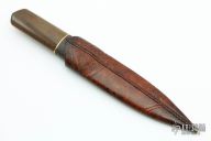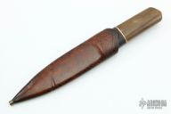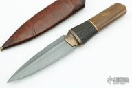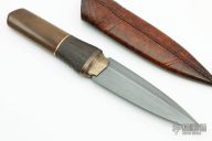 This Harpoon Dagger by Anders Hogstrom features a double-edged blade with beautiful hamon, .241" blade stock and 1.288" blade depth, hidden tang construction. The handle has a textured bronze guard, beautiful walrus ivory grip, bog oak wood piece behind the guard and a bronze spacer. Comes with a hand tooled brown/black leather sheath and a velcro case. New from maker.