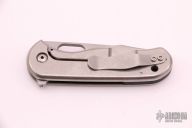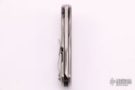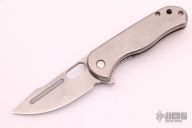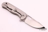 This Shawty 45 by Jeremy Horton and Gerry McGinnis features a tumble finished blade with a chisel grind and a convex grind tip, flipper, fuller and thumbhole. The handle has a tumble finished titanium frame with a matching tip up clip and black G-10 backspacer. Has nice detent, lockup and blade seating. Has a scratch on the clip, otherwise excellent condition. 5-15-15 and #018 inside the frame. Comes with a zippered case.