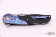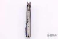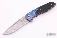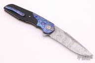 This Hanan from Brad Southard features a Damasteel recurve blade with notched thumbrest and flipper. The handle has zircuti bolsters, black G-10 scales and pivot inlay, tip up mokuti clip and backspacer. Stainless hardware. Nice detent, action, lockup and blade seating. This knife has ceramic ball bearings and detent. Comes with a zippered case. Excellent condition.