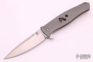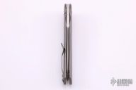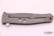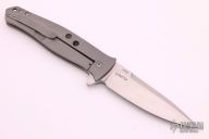 This Dr. Death is a flipper by Tom Mayo. The Dr. Death flipper has very smooth action and good detent, lockup and blade seating. Bead blasted titanium frame with drilled hole accent, standoffs, lanyard hole. The blade is hand rub satin finished with flipper. Excellent condition. Comes with a zippered case.