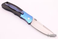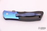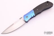 This SD-3 by John W Smith features a spear point hand rub satin finished blade with thumb-disc and notched thumbrest. The handle has dovetailed timascus bolsters, anodized titanium liners and tip up clip, lightning strike carbon fiber scales, black G-10 backspacer. Nice detent, lockup, and blade seating. Excellent condition. Comes with velcro case.