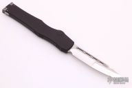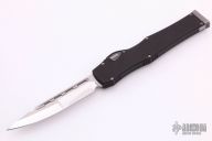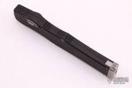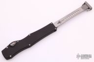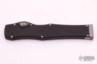 This Halo VI features a mirror polished blade with satin flats and blasted fullers. Its handle is made from black Mil-Spec anodized alloy with blasted hardware. The charging handle comes marked with the Marfione Custom Knives logo and dated 03/2018 and 016. The Halo VI sets itself apart from previous models with added safety features and an improved charging handle mechanism. The firing button has been upgraded with an integrated safety to prevent accidental deployment. Pull the mini-slider and press the button in one easy motion to fire the blade. Its upgraded charging handle is built with dual pivoting latches that create a secure seal in the closed position. Comes with original box, COA and zippered case. Excellent condition.