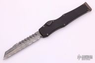 This Halo VI features a Chad Nichols CTS-XHP Core Damascus Warhound blade with notched spine. Its handle is made from black Mil-Spec anodized alloy with anodized hardware. The charging handle comes marked with the Marfione Custom Knives logo and dated 05/2018 along with serial number 010. Comes with original box, zippered case and papers. Excellent condition.