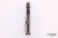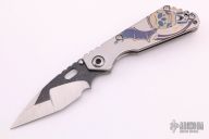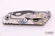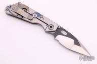 This SNG framelock folder by Mick Strider features a two-tone nightmare ground blade and an orange peel finished and laser engraved titanium frame and tip up titanium clip. Includes a "Lock Bar Stabilizer" for maximum reverse lock retention. Nice detent, lockup and blade seating. New condition. Comes with a velcro case.
