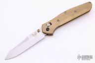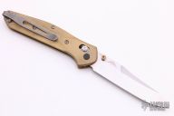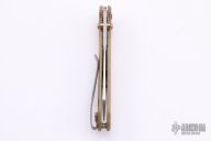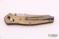 This Benchmade Osborne 940 features a tumble finished clip point blade with swedge and dual thumb studs. The handle is comprised of a machined brass frame, deep carry titanium tip up clip. Comes with original box and papers. Excellent condition. Does not come with original scales.
