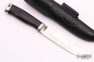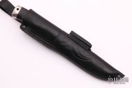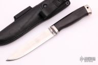 This hunter (please let us know if you know who made this knife) features a hand forged and hollow ground blade with a sort of scandi ground final edge, .217" blade stock and 1.060" blade depth, hidden tang construction. The handle has stainless steel guard and butt with a black wood grip. Comes with a black leather sheath. Excellent condition.