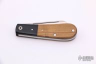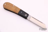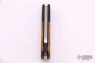 This knife by K'roo Knives features a satin finished blade with nail nick. The handle has black G-10 bolsters, wood covers, black G-10 liners and a stainless steel spring. Has a couple light scratches, otherwise excellent condition.