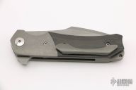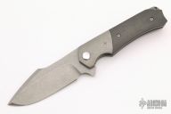 This Linerlock Flipper by Koert Knives features a tumble finished blade with swedge and flipper. The handle has tumbled titanium bolsters, backspacer, liners and tip up clip with hidden screws, uni-lateral carbon fiber scales. Rides on bearings, nice detent, lockup and blade seating. Excellent condition.