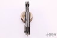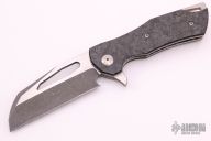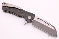 This Linerlock Flipper by Robert Oldaker features a two-tone blade with notched thumbrest and flipper. The handle has shard carbon fiber scales, titanium liners, backspacer and tip up clip. Nice detent, lockup and blade seating, rides on bearings. Comes with a zippered case. Has some light scratches, otherwise excellent condition.