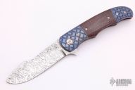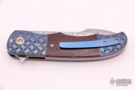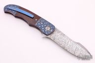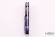This LL-BB Flipper by George Muller features a Damasteel blade with false top edge and flipper. The handle has Engraved and dovetailed anodized titanium bolsters, front and rear, red/black lightning strike carbon fiber scales, anodized titanium liners, Damasteel backspacer and an anodized titanium tip up clip. Features IKBS(caged Bearings). Nice detent, blade seating and lockup. Comes with a zippered case. Excellent Condition.