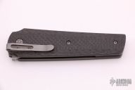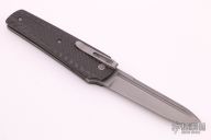 This Linerlock Flipper by Tom Ferry is a Liong Mah design, has a tumble finished blade with fullers. The handle has carbon fiber scales, bead blasted titanium liners and carbon fiber backspacer. Stainless steel tip down clip. Very smooth flipper opening that requires no wrist action. Nice blade seating and detent, with good lockup. Excellent condition.
