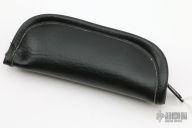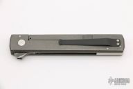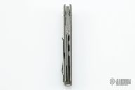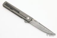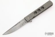 This Buzz by Jason Clark features a Glock Damascus blade with swedge and checkered flipper. The handle has a tumble finished titanium frame with  tip up blackened titanium clip and a stainless steel backspacer. Rides on IKBS. Comes with leather zippered case and COA dated May 15, 2017. Nice detent, lockup and blade seating. Excellent condition.