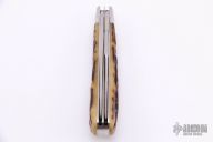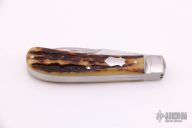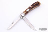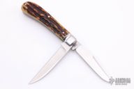 This 2-Blade Wharncliffe Trapper by the Late Tony Bose features satin finished blades with nail nicks. The handle has fluted stainless steel bolsters, stag covers with stainless steel shield escutcheon, stainless steel liners and springs. Comes with a Bill's velcro case. Has some light scratches, otherwise good condition.