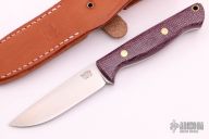 This Field Gunny by Bark River Knives features a satin finished blade with notched thumbrest, .133" blade stock and .946" blade depth, full tang construction. The handle has Royal & Gold flecked burlap micarta scales with red liners. Comes with a brown leather sheath and original box. Excellent condition.