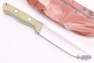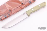 This Bravo 1.5 from Bark River features a satin finished blade and Dune G-10 scales, full tang construction with .219" blade thickness and 1.170" blade depth. Notched thumb ramp. Includes brown leather sheath with belt loop and original box. Excellent condition.