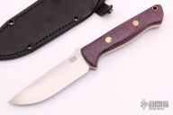 This Bravo 1 by Bark River Knives features a satin finished blade with a notched thumbrest, .219" blade stock and 1.161" blade depth, full tang construction. The handle has Royal & Gold flecked burlap micarta scales with yellow liners. Comes with a black leather sheath and original box. Excellent condition.