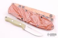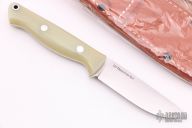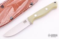 This Mini Gunny by Bark River Knives features a satin finished S45VN blade with .129" blade stock and .877" blade depth, full tang construction. The handle has Dune G-10 scales with yellow G-10 liners. Comes with a brown leather sheath and original box. Excellent condition. 1st Production Run