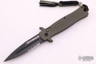 This collaboration between Darrel Ralph and Ryan Wilson of Wilson Tactical is the Stiletto Auto with green aluminum handle. Black coated partially serrated blade with fullers in the center and a ground but not sharpened top edge. Smooth firing auto with a strong lock up. Has some light scuffs, otherwise good condition. Comes with original box.