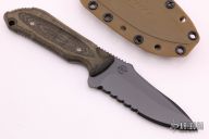 The Echo was designed to the specification of elite special warfare personnel to function as a combat/utility knife in battlefield conditions, including combat swimmer operations. Its serrations and asymmetrical grind planes create a sleek blade with a thick, tough spear point that doesn't compromise its cutting geometry. Made from carbon steel, its blade is coated with a layer of rust-proofing to help protect it from corrosion that can quickly take a toll on a knife. Its ergonomically designed Micarta™ handle covers a cutaway steel frame (to reduce weight) and enables a secure grip in even the wettest conditions. An injection-molded sheath—with integrated DMT diamond sharpener—holds the Echo securely in place when not in use.