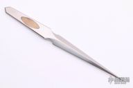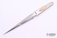 This Dagger by Willie Rigney features a double-edged needle point blade with hand rubbed satin finish. 0.285” blade stock and .708” blade depth. The handle features an integral construction with two Fossil Walrus Ivory Inlays.   Includes a padded zippered case.  This would be a beautiful piece to have engraved! Excellent condition.