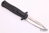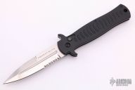 This Automatic Folder from Combat Elite features a partially serrated bayonet ground blade with false top edge and fullers. The handle is comprised of machined black aluminum frame. Push button release and stainless steel tip down clip. Lanyard hole in pommel. Has a few light scuffs, otherwise excellent condition.