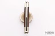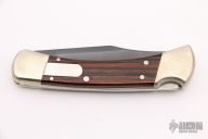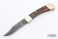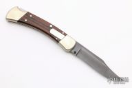 "This old classic BUCK knife 110 "Folding Hunter" was first introduced in 1965 - it has been BUCKS mainstay ever since. Some say the Buck 110 is the most copied knife in the world. This Buck automatic knife has a beautiful dymondwood scales with nickel silver bolsters and a plate that opens knife automatically. A must for any BUCK collection." The blade has been darkened. Has some scratches, otherwise good condition. Left Handed. Comes with black leather sheath.