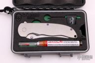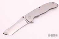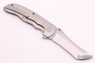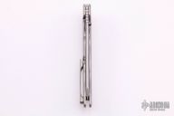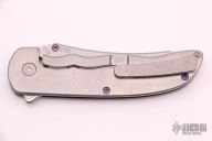 This Norseman (#2799) by John Grimsmo features a stonewashed blade with a single anodized titanium thumb stud, notched thumb ramp and flipper. Tumble finished and Crosshatch textured titanium frame with anodized titanium screws. Very smooth action that requires no wrist movement. Nice detent, lockup and blade seating. Rides on ceramic bearings. Knife is in excellent condition, shows no signs of use or carry. Comes with original packaging, custom hard case, Nano-Oil, tool, and COA dated Sept 18 2019.