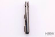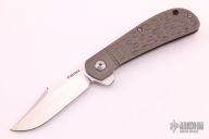 This Lanny's Clip flipper from Enrique Pena features a hand rub satin finished blade with swedge and notched flipper. The handle has a bead blasted, jigged and anodized titanium frame with blue anodized titanium backspacer and hardware, tip up titanium clip. Nice detent, lockup and blade seating, rides on bearings. Comes with nylon zippered case. Excellent condition.