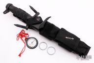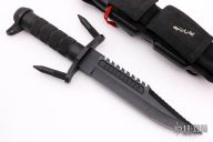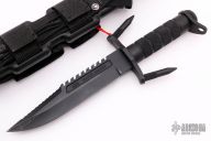This Buckmaster 184 from Buck Knives has a black blade with a sharpened and serrated top edge, has sawteeth on spine, .288" blade stock and 1.461" blade depth, hidden tang construction and a hollow knurled handle. Includes original sheath, compass and quillions. Has some light scuffs, otherwise good condition.