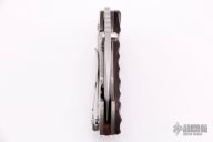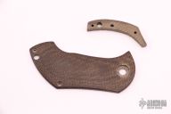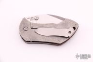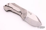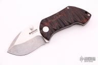 This Pipsqueak by Boker is a Neil Blackwood design. It features a satin and tumble finished recurve blade with single thumbstud and notched thumbrest. The handle has a desert ironwood scale and backspacer, tumble finished titanium liner and lockside with a tip up SS clip. Nice detent, lockup and blade seating. Comes with original box, papers and original scale and backspacer. Has some scratches, otherwise excellent condition. We believe the scale was from Custom Scale Division: cuscadi.de