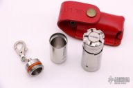 This J2 Titanium Flashlight by JIL Lite. Comes with original box, papers, red leather belt sheath, extra battery capsule, orings, split ring and clip. Excellent condition.
