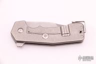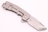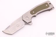 This GMT Rhino Mid-Tech by Jon Graham features a stonewashed blade with flipper. The handle has a stonewashed titanium frame with a green G-10 inlay, matching tip up tail clip and a satin finished lockbar stabilizer. Comes with a cloth pouch. Rides on bearings, nice detent, lockup and blade seating. New from maker.