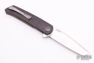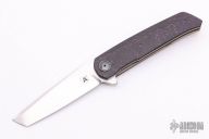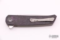 This A7 flipper by Andre Thorburn and Andre van Heerden features a hand rub satin finished tanto blade with swedge, notched thumbrest and flipper. The handle has black/purple fat carbon scales, anodized titanium liners, carbon fiber backspacer, bead blasted titanium tip up clip. Rides on ceramic IKBS. Includes velcro case and COA dated November 2020. Great blade seating, detent and lock up with a very smooth and fast flipping action. Excellent condition.