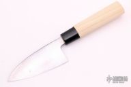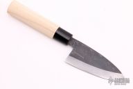 The Ajikiri 90 from Shinichi Watanabe features an iron clad white steel blade with a hidden tang construction. .137" Blade Stock. 1.49" Blade Depth. The handle features dark synthetic hilt nicely complemented by a HO wood grip. This is a fantastic piece that is razor sharp. New from Maker.