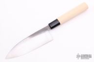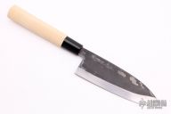 The Ajikiri 135 from Shinichi Watanabe features an iron clad white steel blade with a hidden tang construction. .150" Blade Stock. 1.96" Blade Depth. The handle features dark synthetic hilt nicely complemented by a HO wood grip. This is a fantastic piece that is razor sharp. New from Maker.